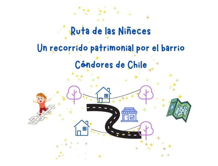 Esta actividad incluye un recorrido por lugares significativos del barrio Cóndores de Chile, de la comuna de El Bosque, que forman parte del patrimonio tangible e intangible de su comunidad residente. Se recorrerán de manera guiada cinco lugares que han sido importantes, especialmente para quienes fueron y quienes hoy son niños y niñas en el barrio.